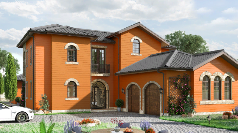 Фибросайдинг применяется в качестве декоративного материала для отделки фасада дома и придания эстетического вида ограждениям, заборам, баням, беседкам и другим постройкам.