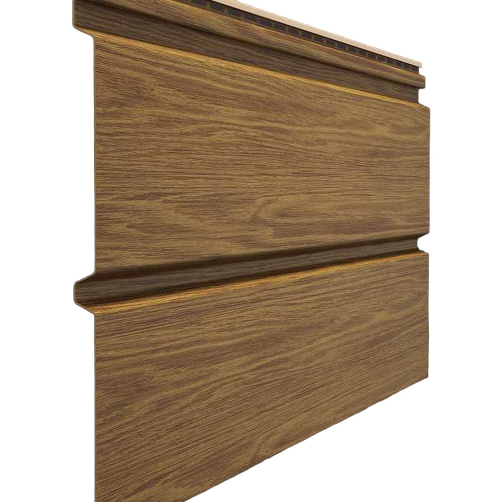 Благодаря глубокой офсетной печати по горячей поверхности панели сайдинга не тускнеют и не выгорают на солнце, сохраняя красивый натуральный тон и естественный древесный рисунок. Для облицовки фасада в единой эстетике используйте углы и профили в цвете «Яблоня».