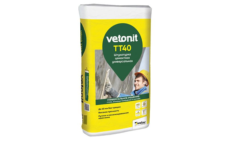 Штукатурка влагостойкая универсальная vetonit TT40. Базовое выравнивание стен и потолков в сухих, влажных и мокрых помещениях перед облицовкой плиткой и природным камнем, нанесением декоративной штукатурки и финишным шпаклеванием. Выравнивание наружных поверхностей зданий при проведении строительных и ремонтных работ.